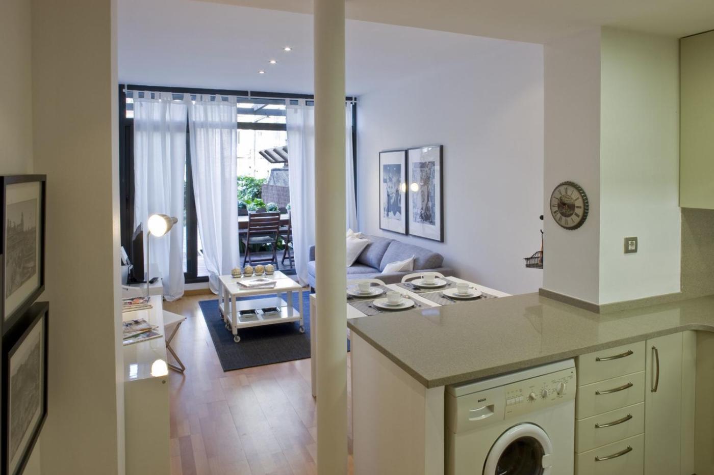 One-Bedroom Apartment. This air-conditioned apartment consists of 1 living room, 1 separate bedroom and 1 bathroom with a bath. Guests can make meals in the kitchen that is equipped with a stovetop, a refrigerator, a dishwasher and kitchenware. Featuring a terrace, this apartment also provides a washing machine, a tea and coffee maker and a flat-screen TV. The unit offers 2 beds.